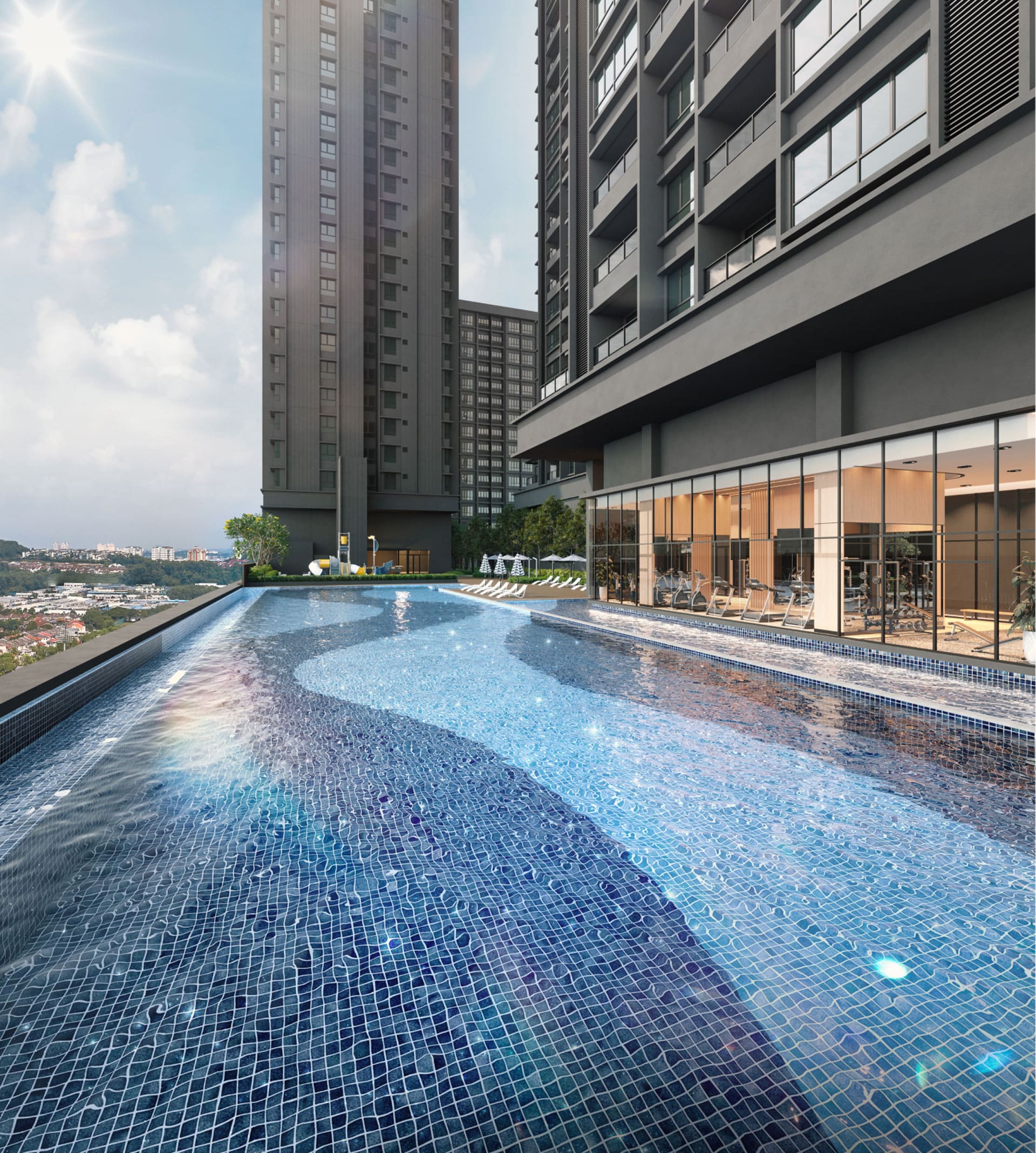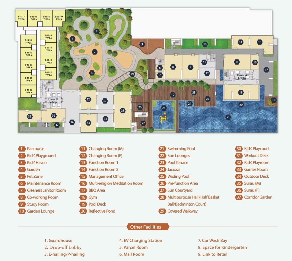 Facilities are comprehensive, including infinity lap pools, children’s playgrounds, pet-friendly zones, co-working / study spaces, a water play pool, games rooms, landscaped garden decks, a lifestyle garden deck, EV charging provisions, gym and more.