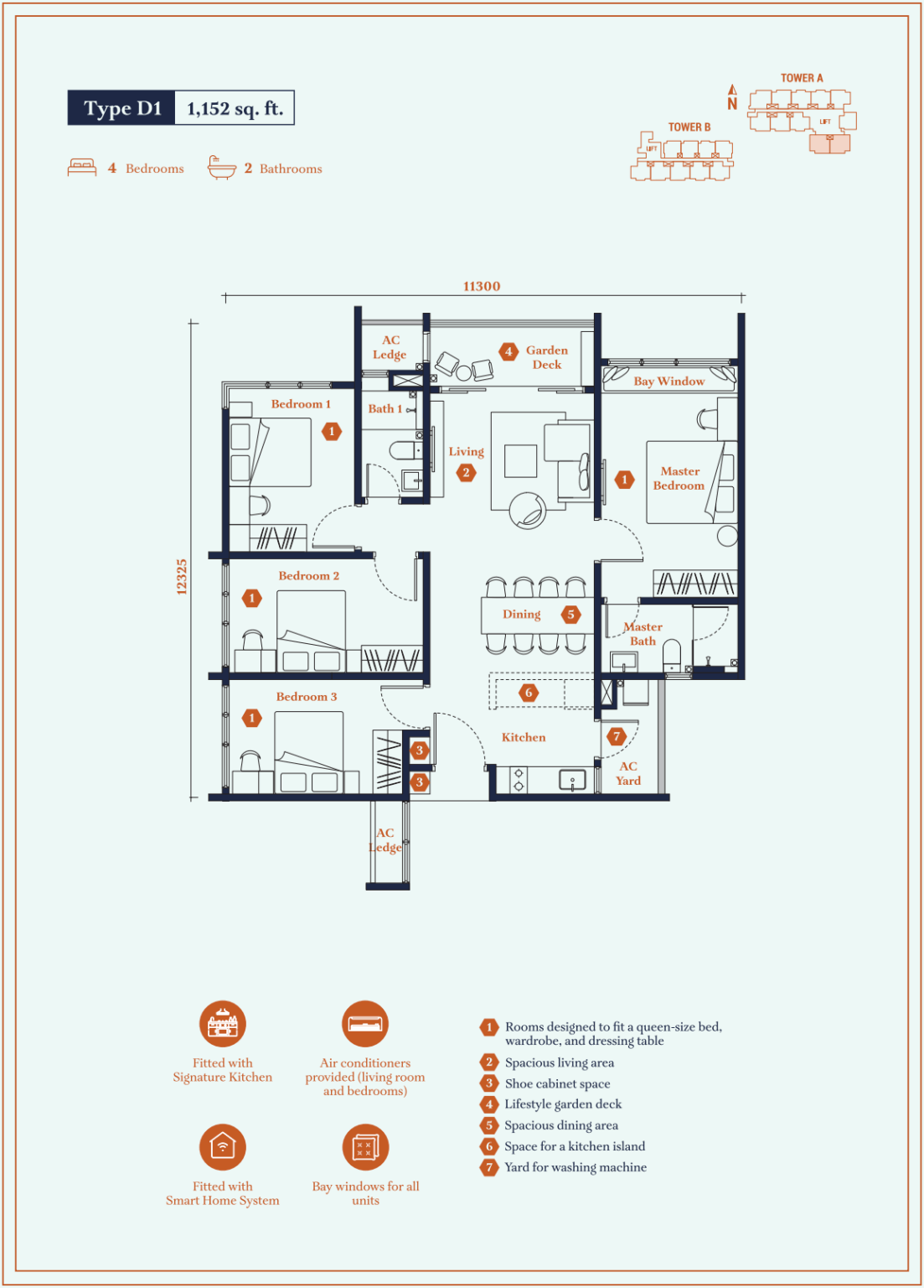 | Type D1 | 1152 sq. ft. |