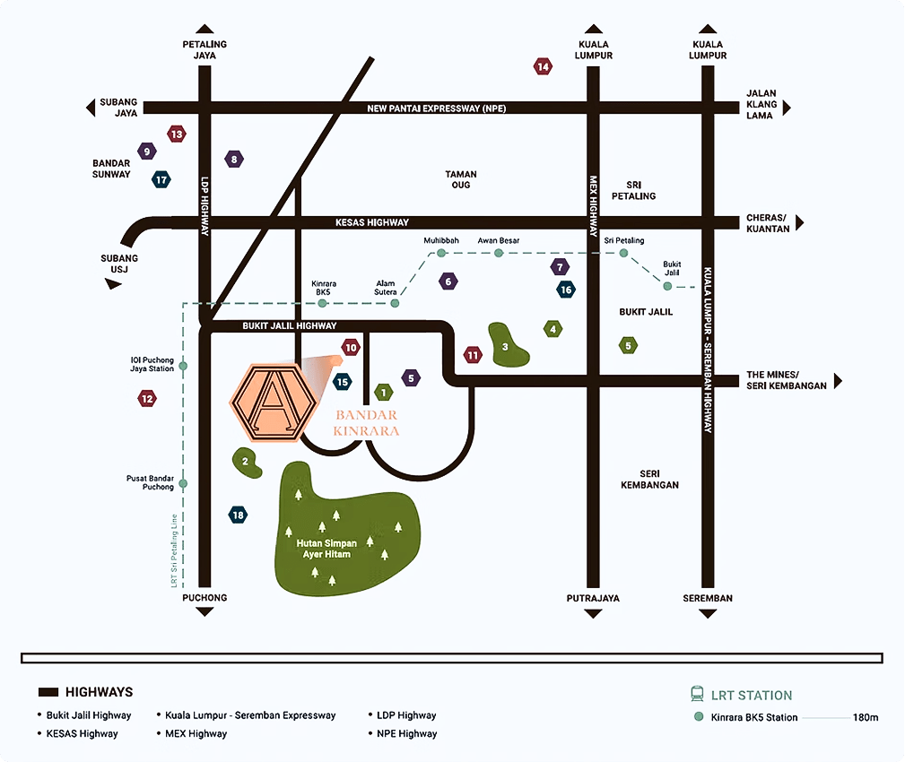 - Prime Location within Bandar Kinrara – Situated in a mature township, the residence enjoys proximity to established amenities such as Giant Kinrara, IOI Mall Puchong, Pavilion Bukit Jalil, and reputable schools. Residents can enjoy city convenience without the chaos of the city centre.