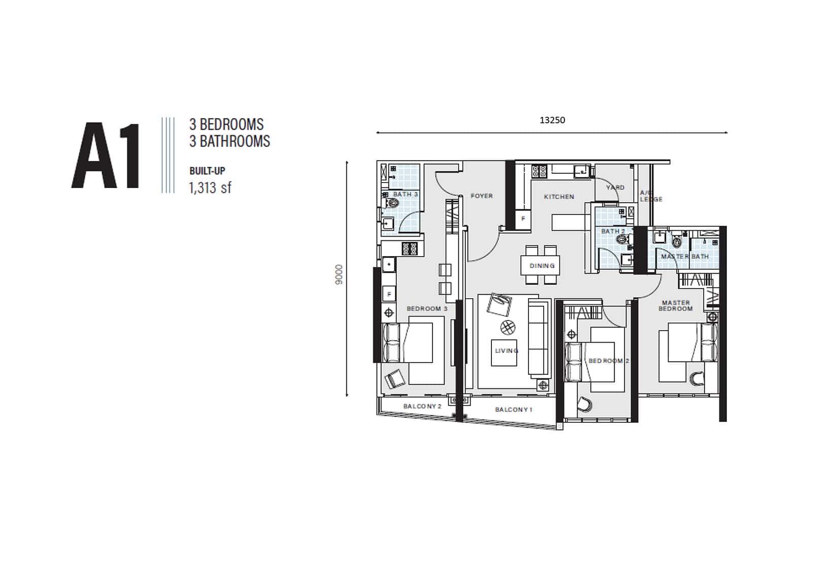 | Type A1 | 1313 sq. ft. |