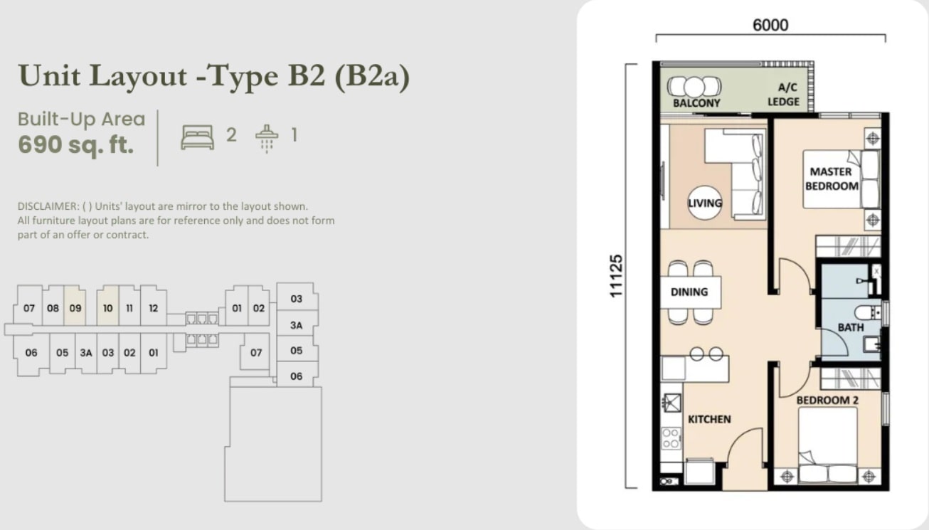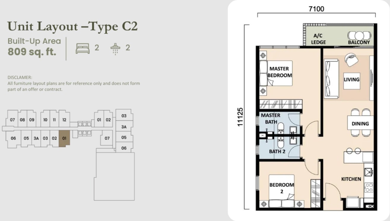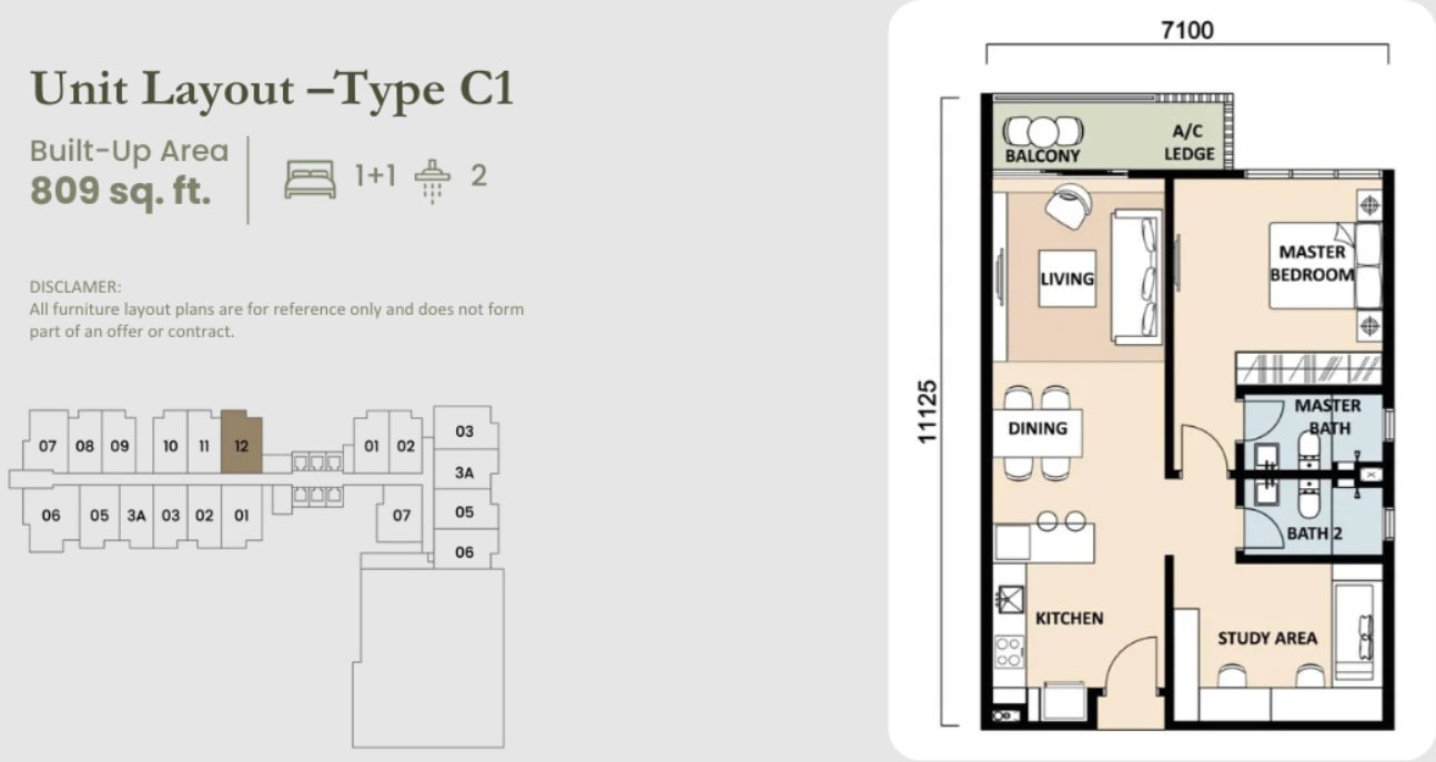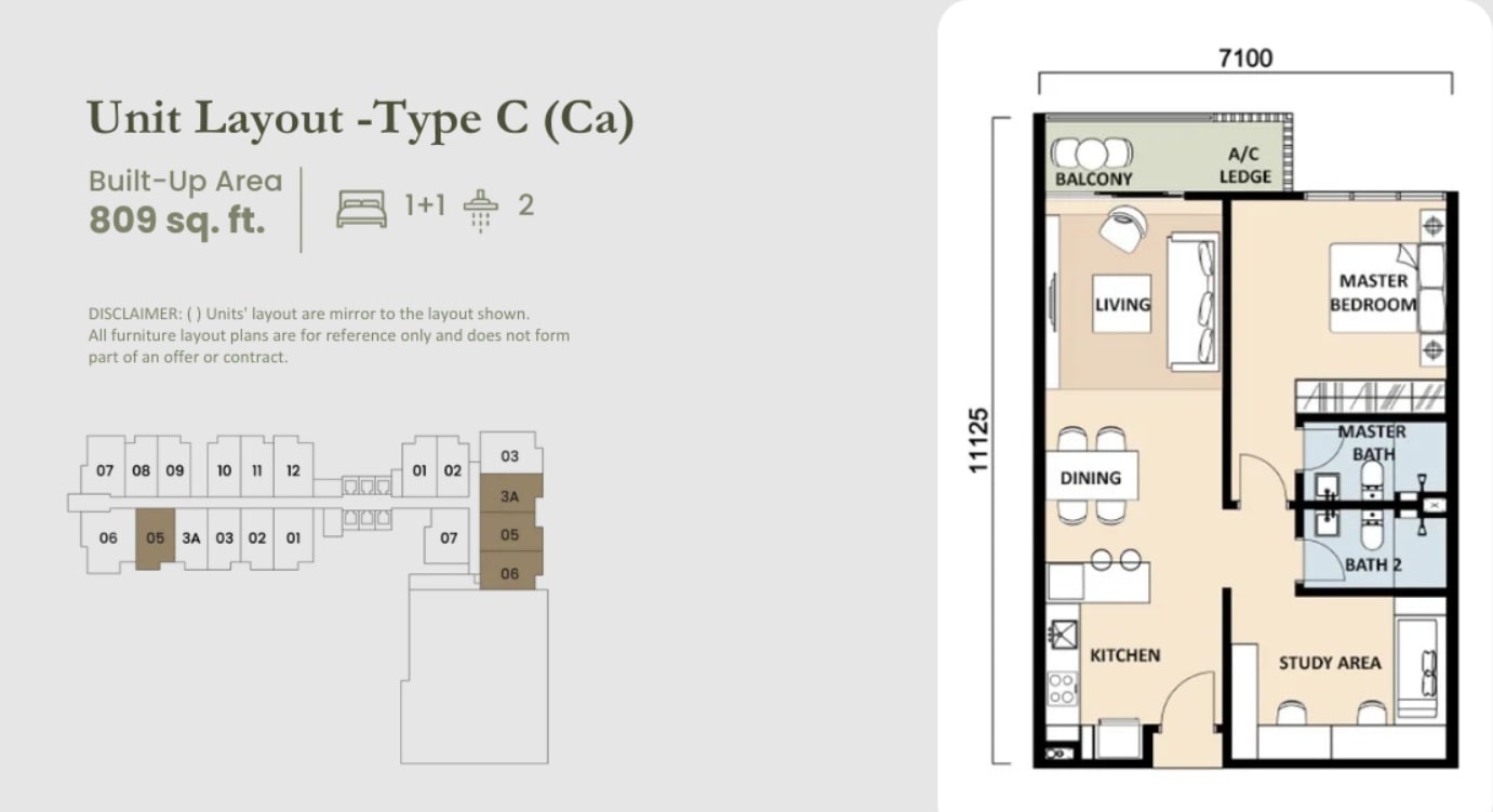 Units begin from around RM413,000 for smaller residential layouts (2 bedrooms, 1 bathroom, ~690–806 sq ft) for certain unit types. The office suites are larger and suitable for buyers seeking flexibility of workspace/home or investors.