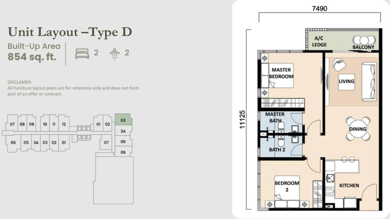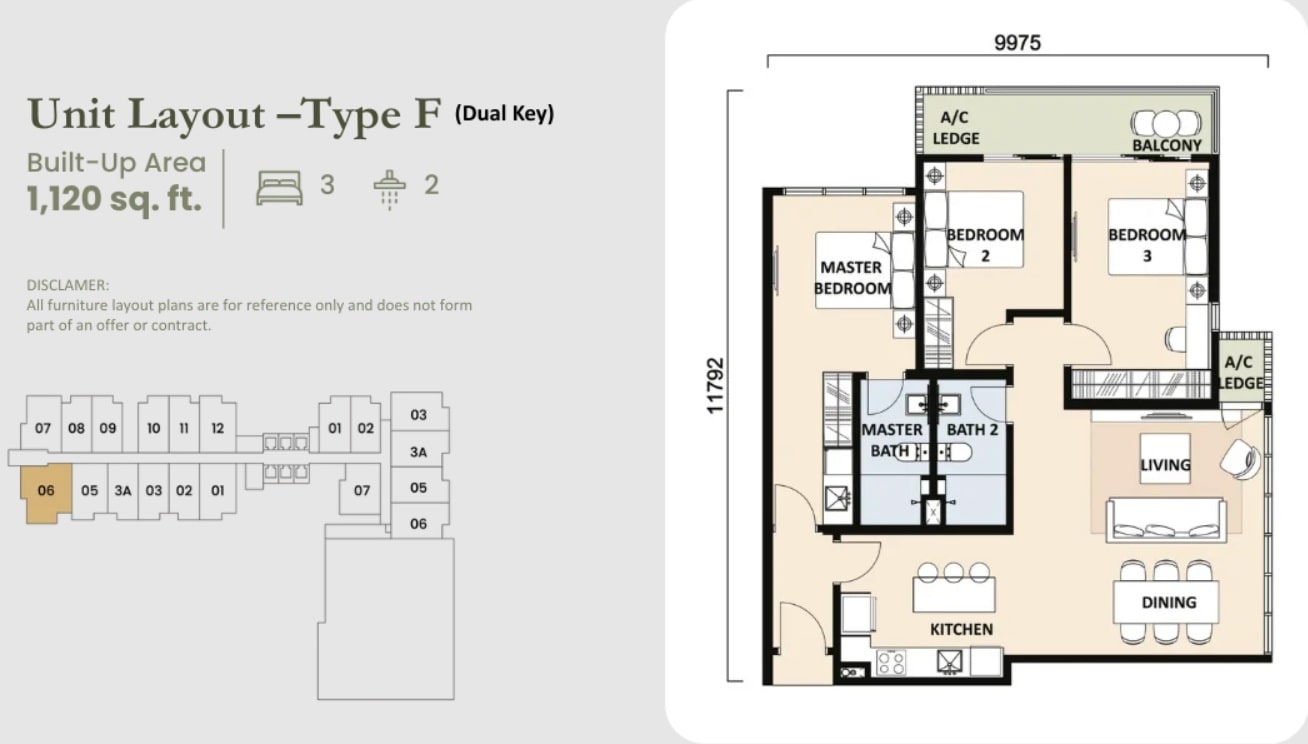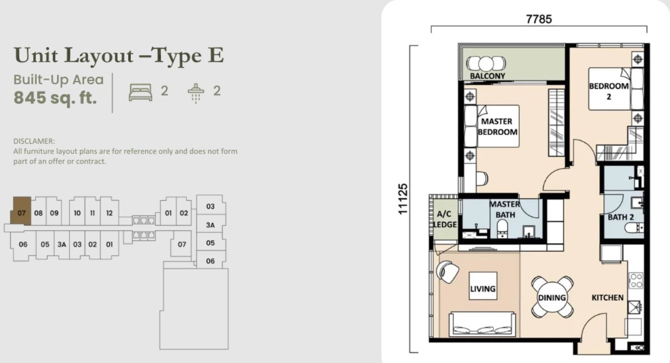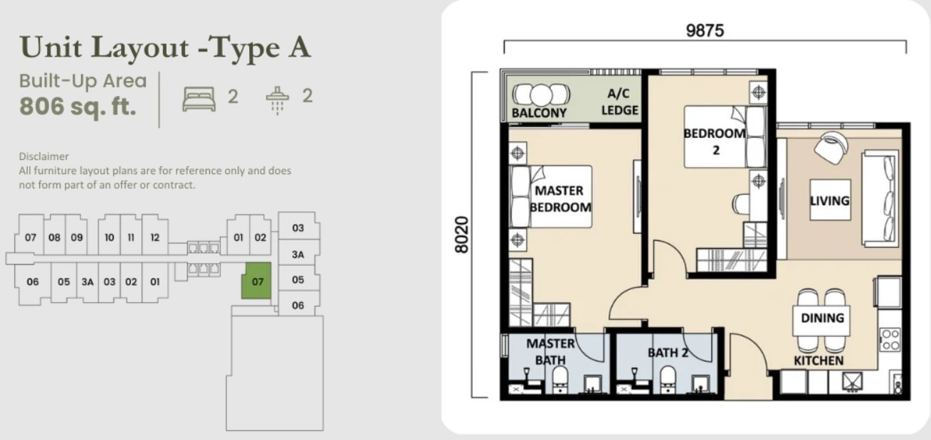 Units begin from around RM413,000 for smaller residential layouts (2 bedrooms, 1 bathroom, ~690–806 sq ft) for certain unit types. The office suites are larger and suitable for buyers seeking flexibility of workspace/home or investors.