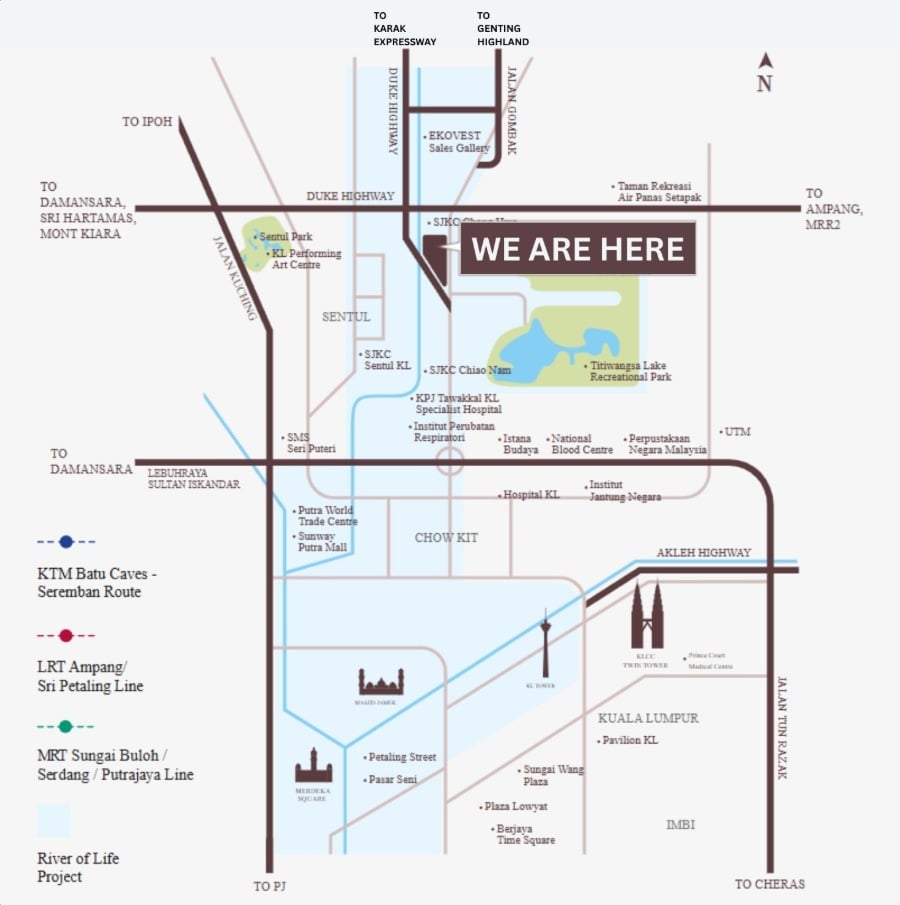Eko Titiwangsa is well-placed on Jalan Pahang, near the fringe of the Kuala Lumpur city centre, offering quick access via major highways like the DUKE, Sentul Link, and MRR2. Public transport including LRT/Monorail/MRT are reasonably near, and a shuttle service is provided to ease access.