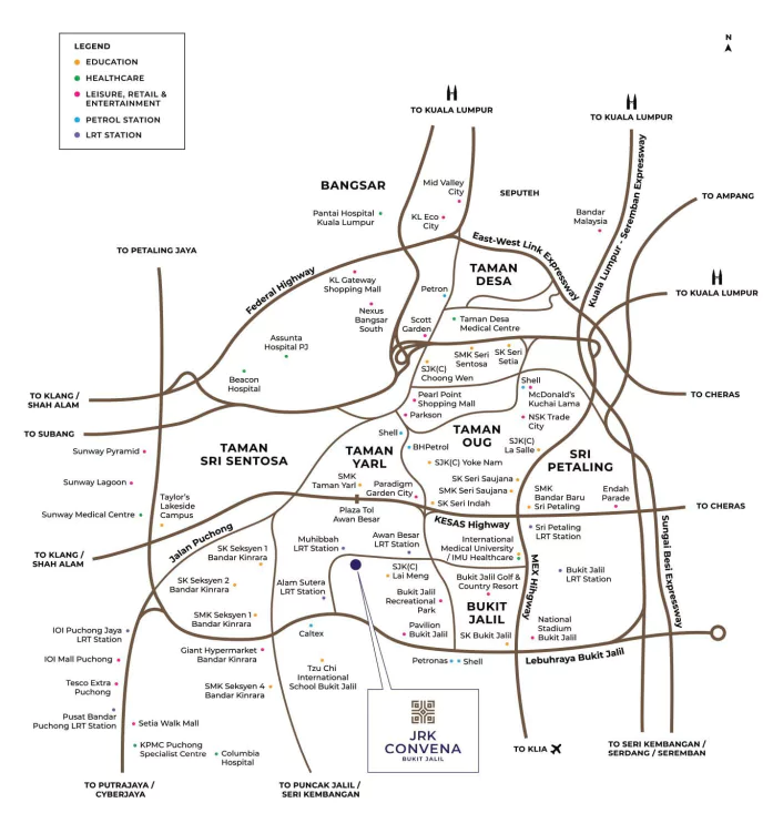 The term ‘Convena’ within JRK Convena originates from the fusion of two words – ‘Convenient’ and ‘Convene,’ which apartment symbolizes this project’s exceptional positioning and its closeness to essential facilities. Functioning as a Transit-Oriented Development (TOD), inhabitants will have the convenience of accessing the neighboring Muhibbah LRT station by a sheltered walkway spanning 250m. Furthermore, its advantageous placement in Taman Muhibbah (situated in Bukit Jalil, close to the Puchong border) positions it in proximity to well-established areas such as Cheras, Sungai Besi, and Sri Petaling.