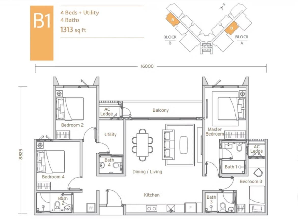 | Type B1 | 1313 sq. ft. |