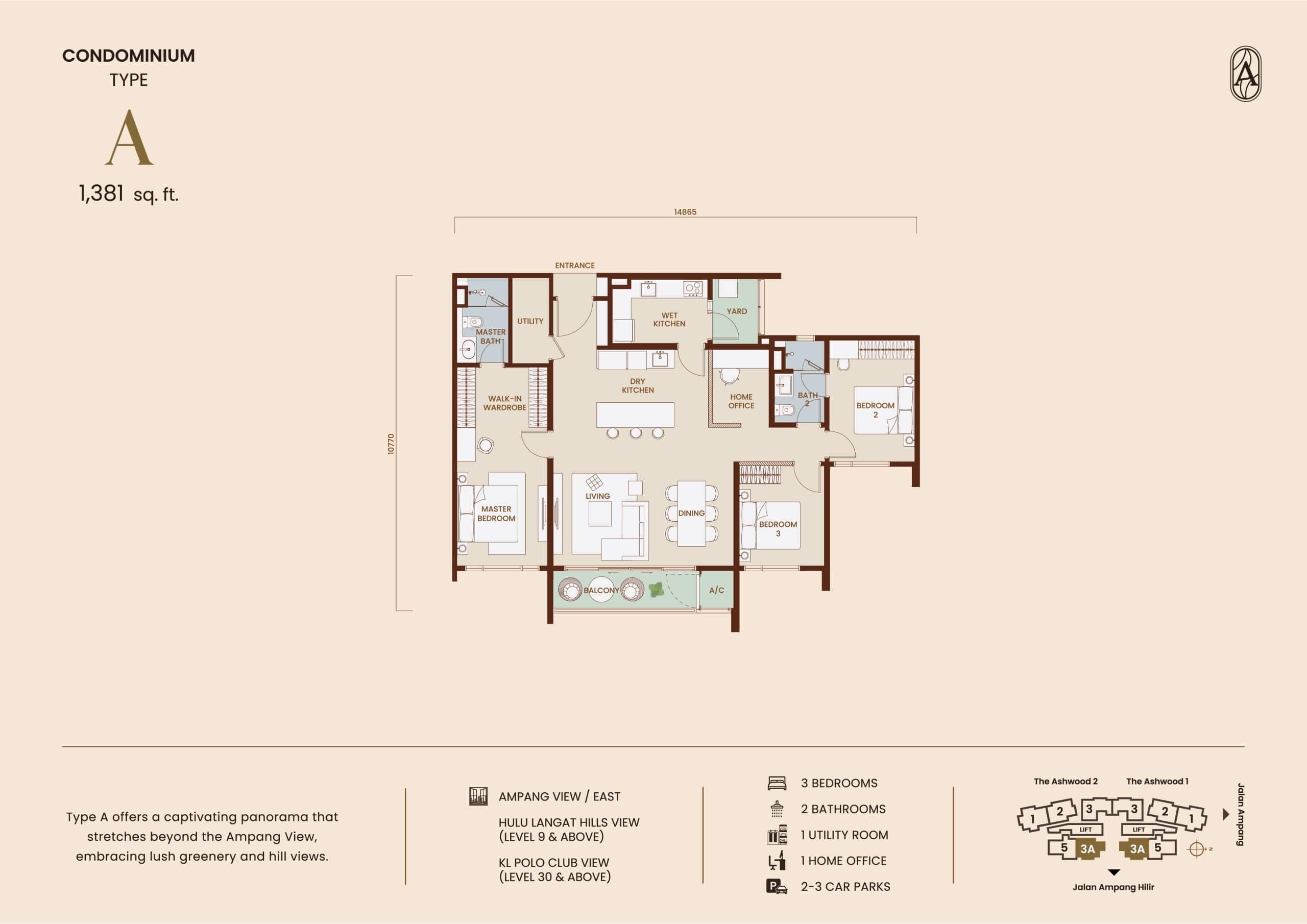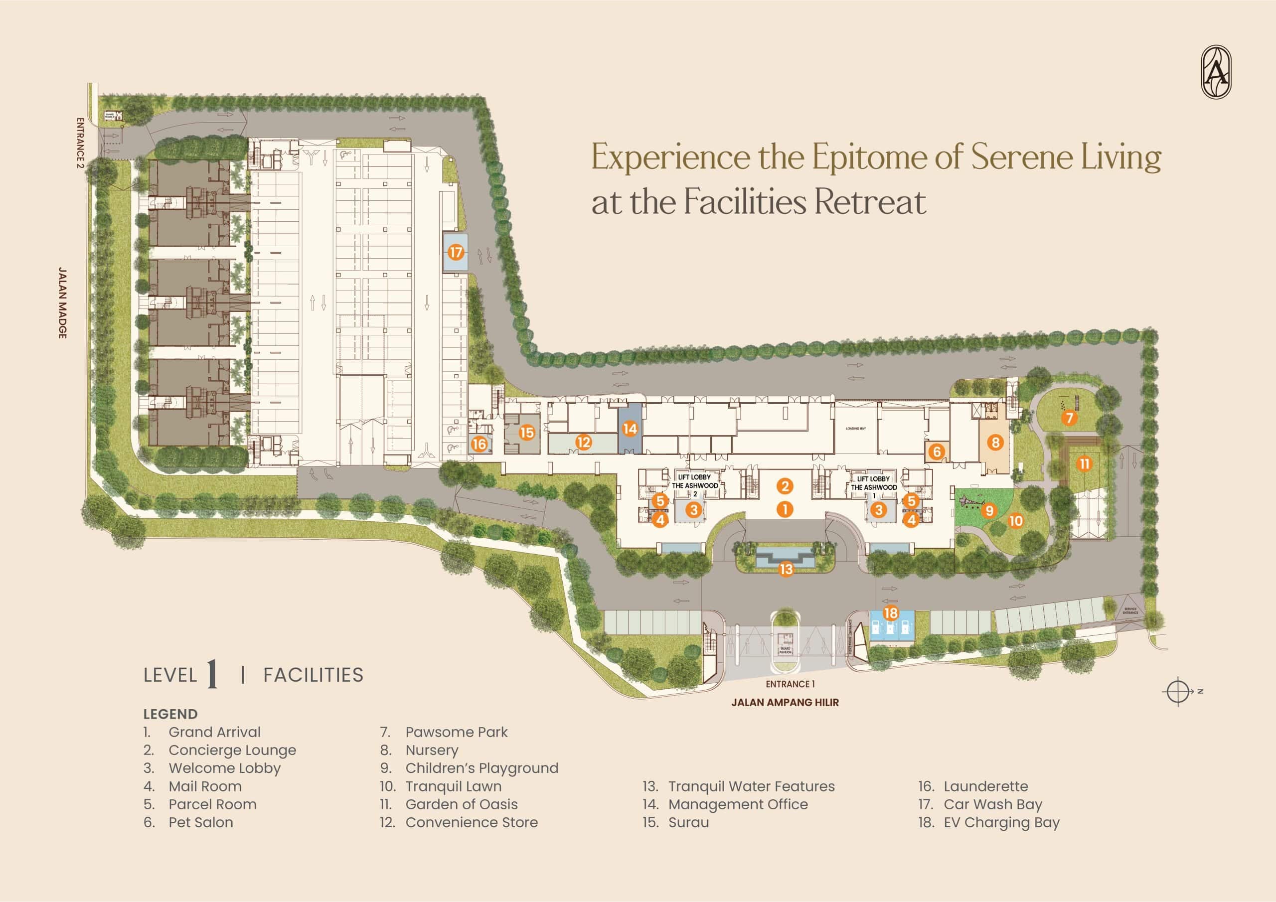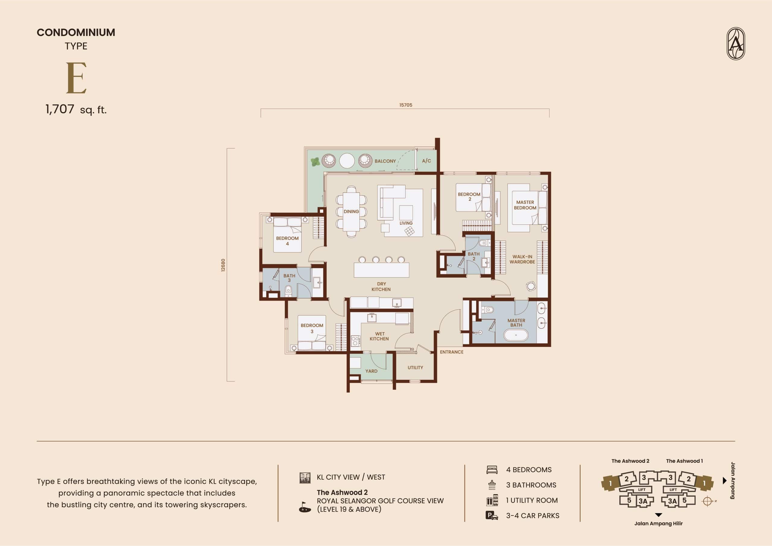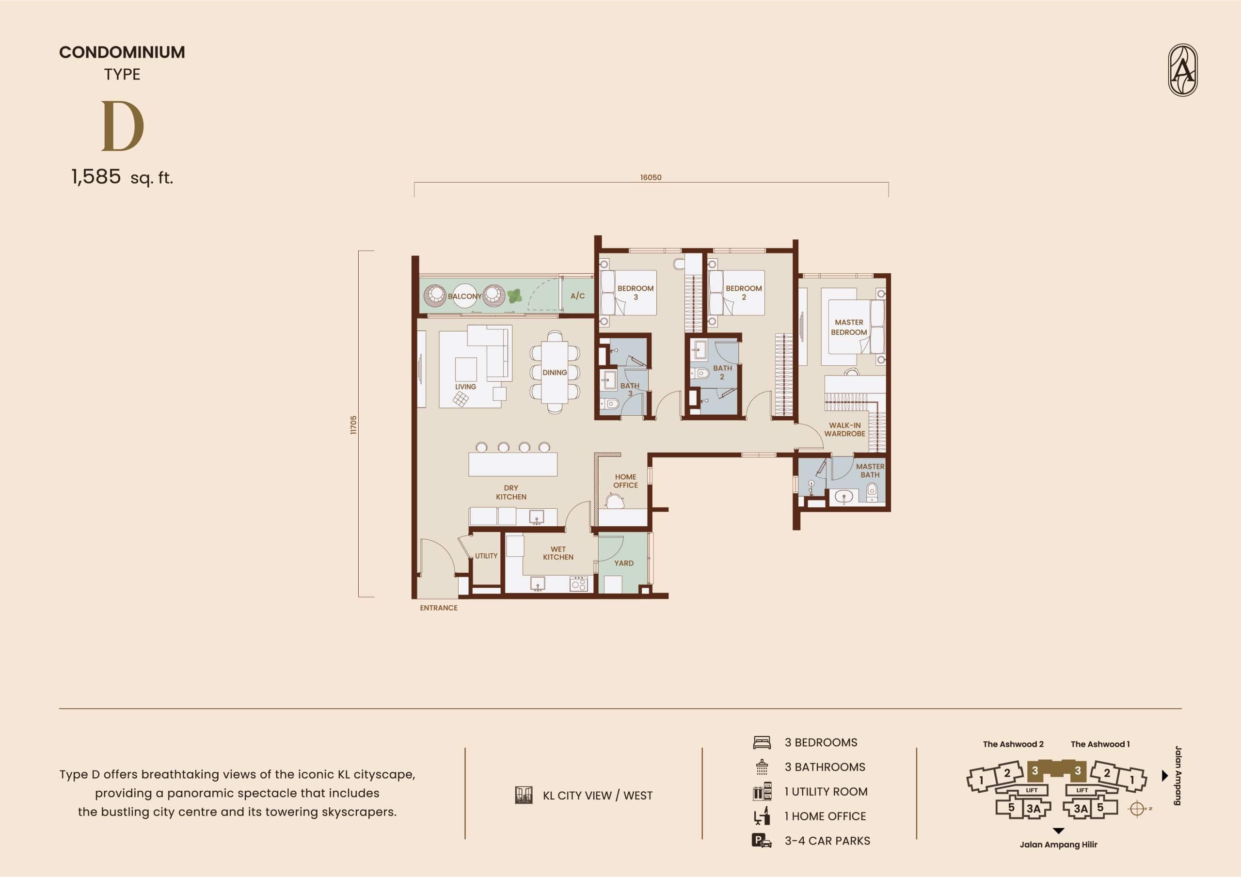The Ashwood’s concept revolves around “tranquility within the city” and resort-style living in a premium address. The developer describes the tagline as “Where Tranquility Resides”, emphasising the idea of an urban haven overlooking both the Kuala Lumpur skyline and the Royal Selangor Golf Course.