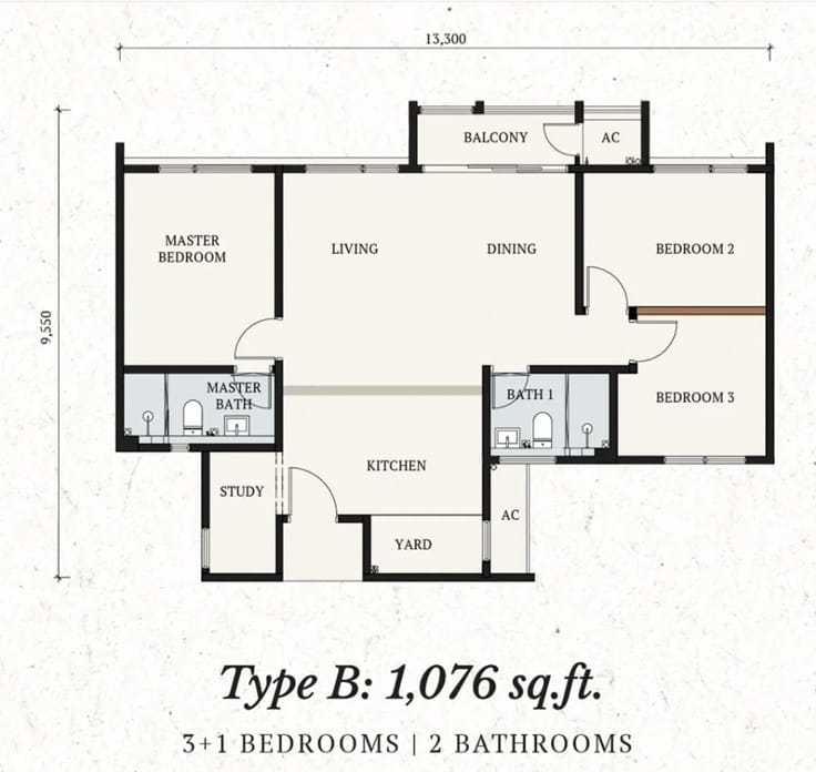 | Type B | 1076 sq. ft. |