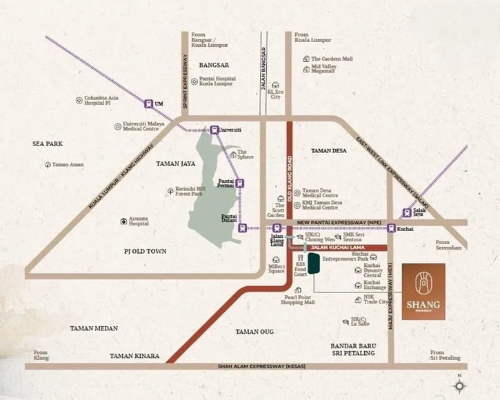 The Shang Residence enjoys a strategic location in Kuchai Lama, a well-established residential area known for its strong connectivity and proximity to key commercial hubs such as Mid Valley, Bangsar South and Kuala Lumpur city centre.