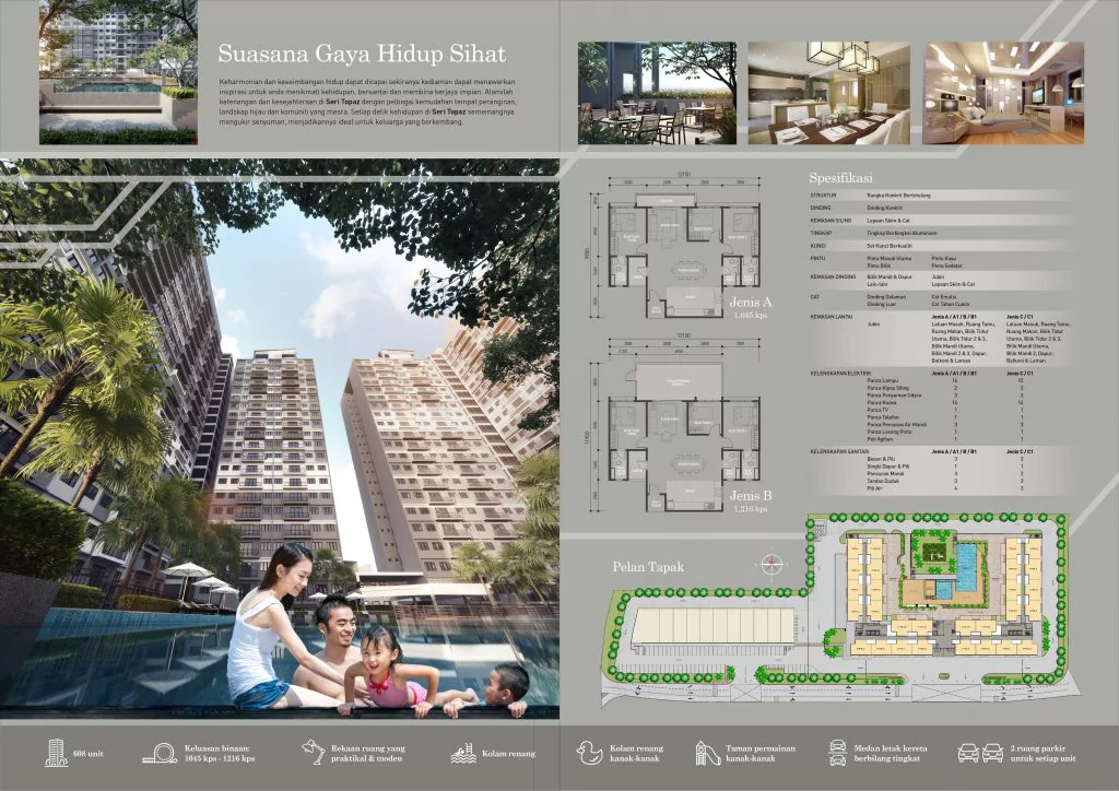 Harmony and balance of life can be achieved if the residence can offer inspiration for you to enjoy life, relax and build a dream career. Experience tranquility and well -being at Seri Topaz with its various resort facilities, green landscapes and friendly community. Every moment of life at Seri Topaz is truly sculpted with a smile, making it ideal for a growing family.