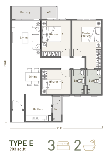 The development primarily offers Type E units: 903 sq ft apartments featuring 3 bedrooms, 2 bathrooms, a balcony, yard, and 2 parking bays, priced around RM250,000–RM300,000. Some smaller 800 sq ft units (Type C) have already sold out. Estimated for completion by Q4 2025.
